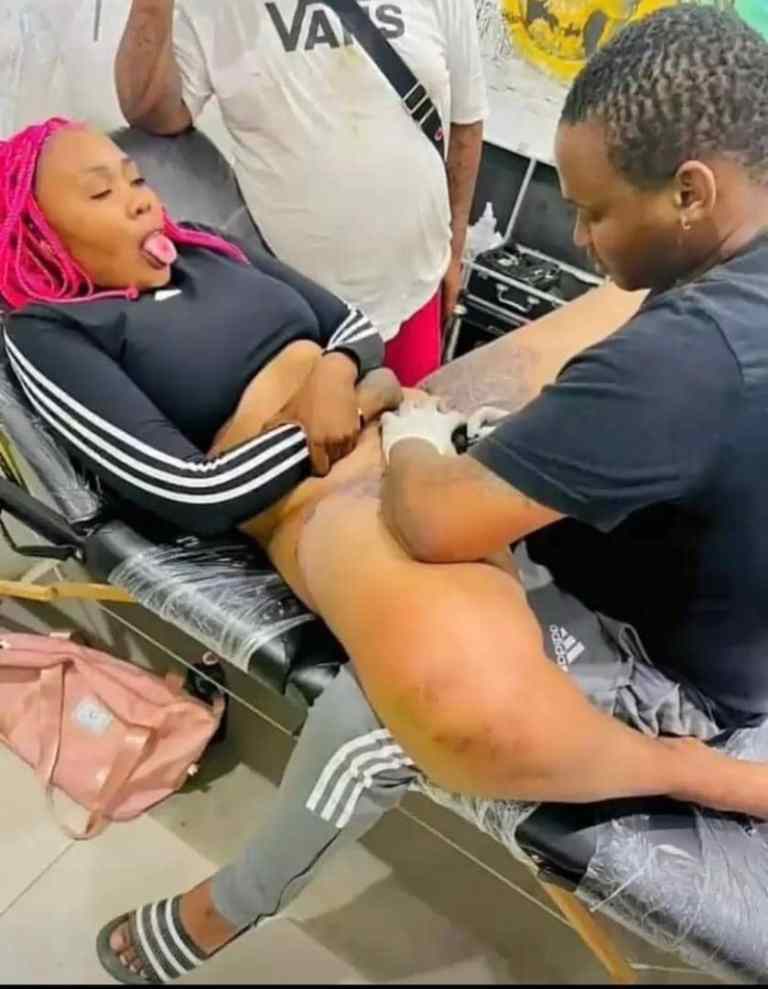 A trending photos of a man has sparked reactions online after he was captured standing by his girlfriend while another man draws tattoo on her private part.