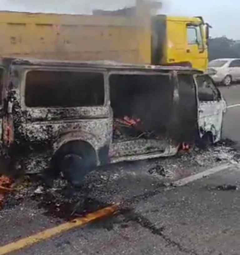 A Toyota Hiace with number plate AFN117YL burst into flames while in motion on the long bridge of the Lagos-Ibadan Expressway on Saturday morning.