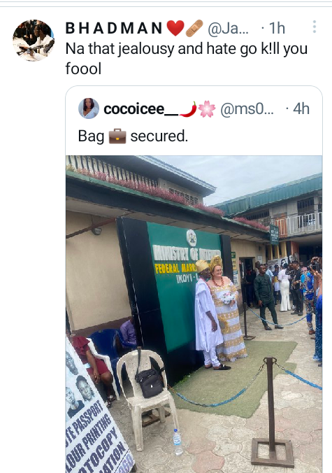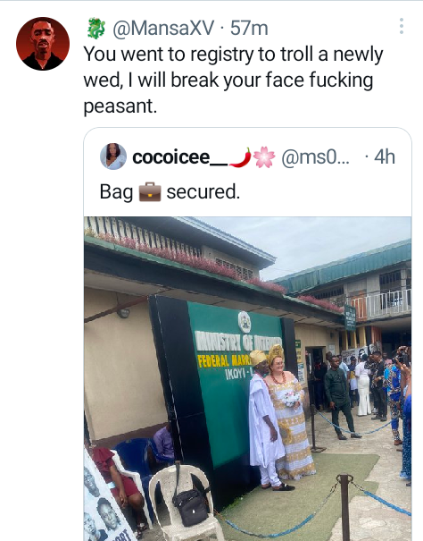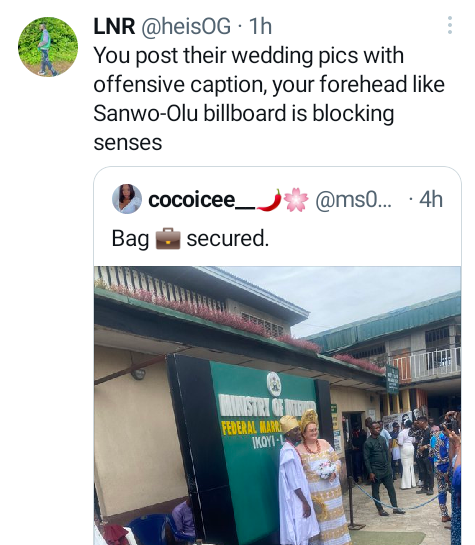 “You post their wedding pics with offensive caption, your forehead like Sanwo-Olu billboard is blocking senses,” one wrote.