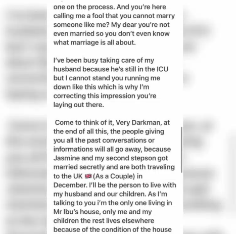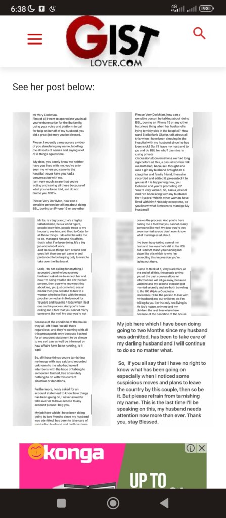 Stella, the wife of popular Nollywood actor Mr Ibu, presents her side of the tale, denying plans to use Mr Ibu’s donations to purchase an iPhone and do BBL and accusing her stepson and Jasmine of preparing to move to the UK as a couple.