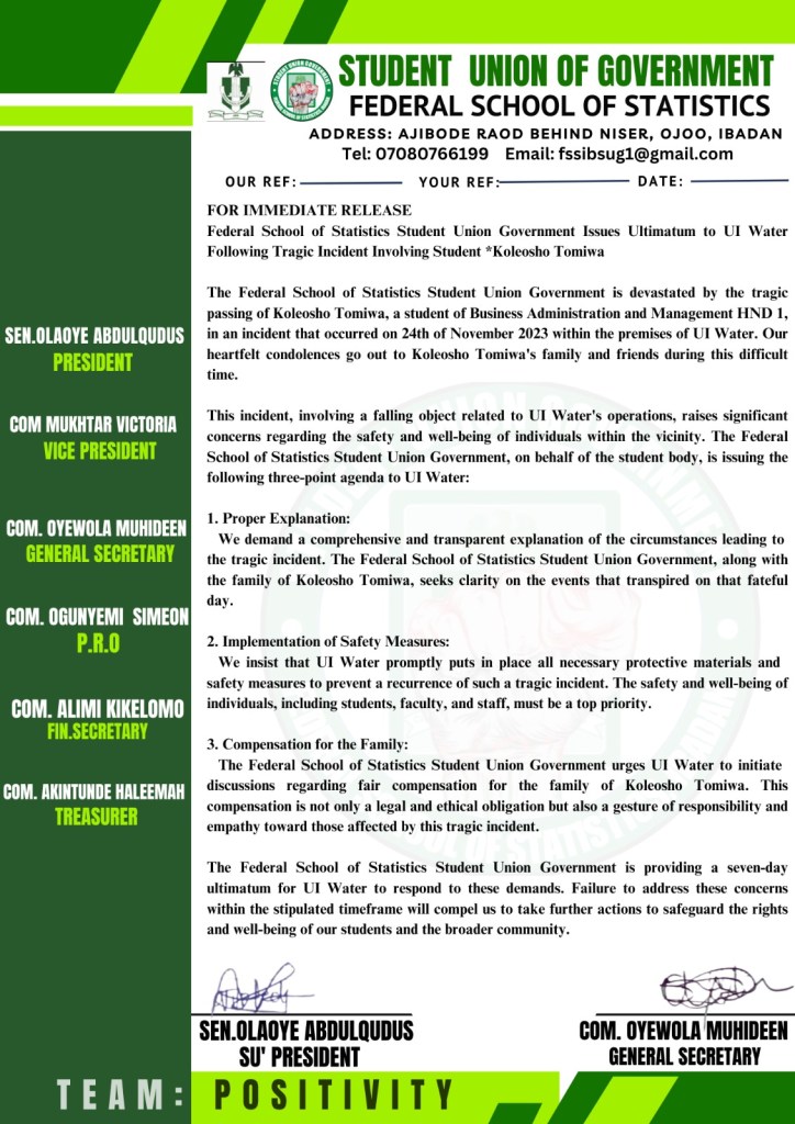 Federal School of Statistics Student Union Government urges UI Water to initiate discussions regarding fair compensation for the family of Koleosho Tomiwa. This compensation is not only a legal and ethical obligation but also a gesture of responsibility and empathy toward those affected by this tragic incident.