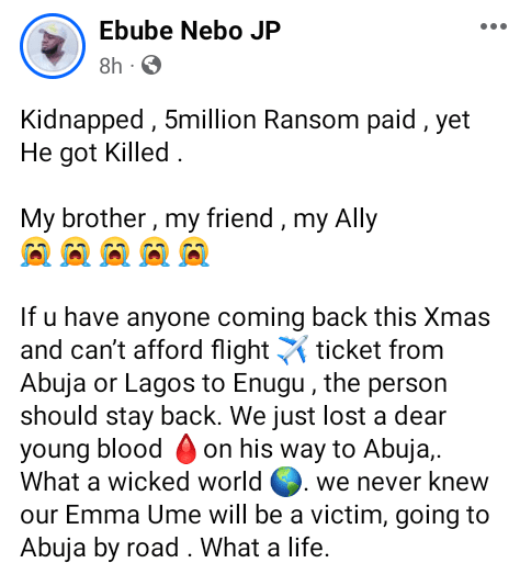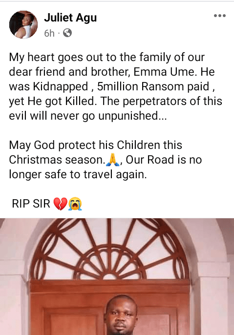 My heart goes out to the family of our dear friend and brother, Emma Ume. He was Kidnapped, 5million Ransom paid, yet He got Killed. The perpetrators of this evil will never go unpunished. May God protect his Children this Christmas season. Our Road is no longer safe to travel again. RIP SIR,” she wrote.