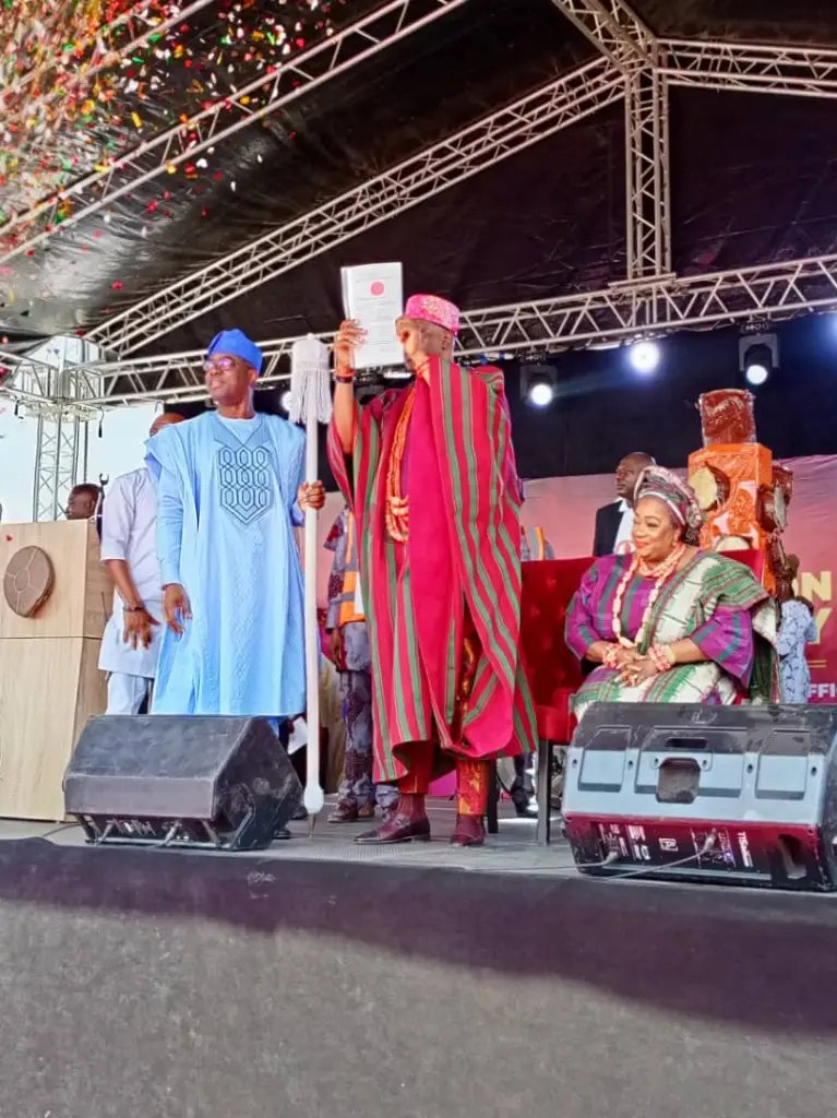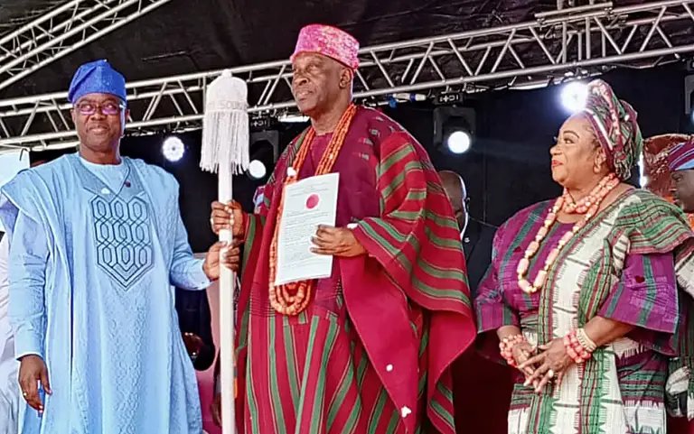 Oyo state governor Seyi Makinde, on Tuesday, presented the staff of office and instrument of office to the new Soun of Ogbomoso, Oba Afolabi Ghandi Olaoye Orumogege III.