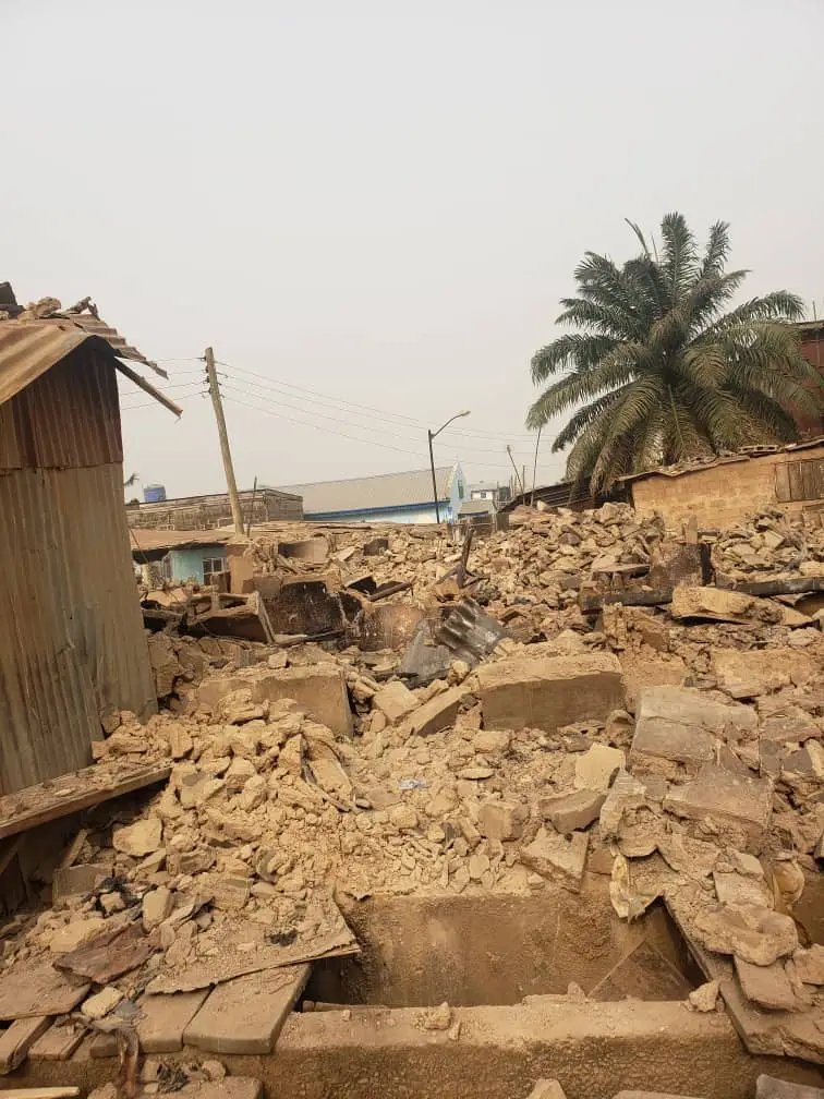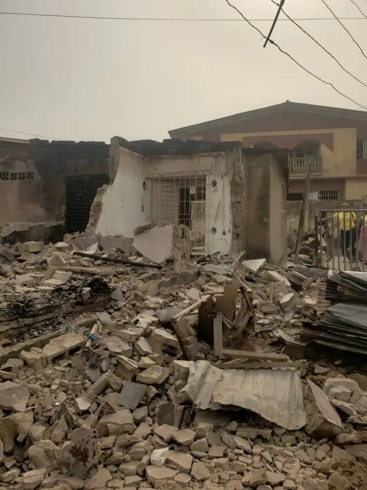 The whole building of 14 rooms, including shops, completely went down in rubble due to the intensity of the explosion, thereby rendering 11 families homeless.