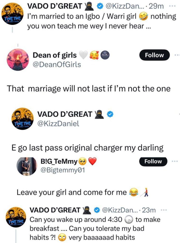 He disclosed this on X while having an exchange with some of his female fans who said they were interested in dating him. Unbothered by the news, one female fan asked the singer to leave his wife for her but he replied by asking her if she can wake up at 4.30am to make him breakfast and if she can tolerate his ‘’very bad habits.