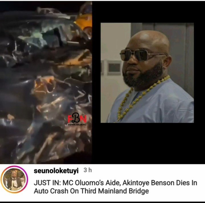 Benson, who was also an aide to the Chairman of the Lagos Chapter of the National Union of Road Transport Workers, Musiliu Akinsanya, aka MC Oluomo, reportedly died on Thursday night in a ghastly motor accident on the Third Mainland Bridge.