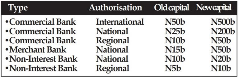 The minimum capital base of N25 billion for commercial banks with national authorisation has been raised to N200 billion (translating to an eight-fold increase).