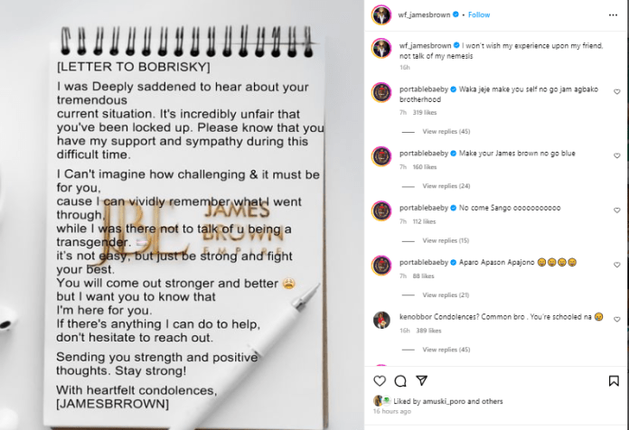 However, James Brown consoled him in a lengthy post as the self-acclaimed ‘Mummy of Lagos’ spent over a week at the EFCC custody.