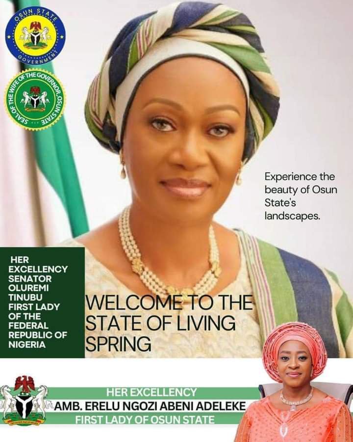 In her poster, Ngozi Adeleke wrote, “Welcome to the state of living spring. Experience the beauty of Osun State’s landscape” and signed off as the First Lady of Osun State.