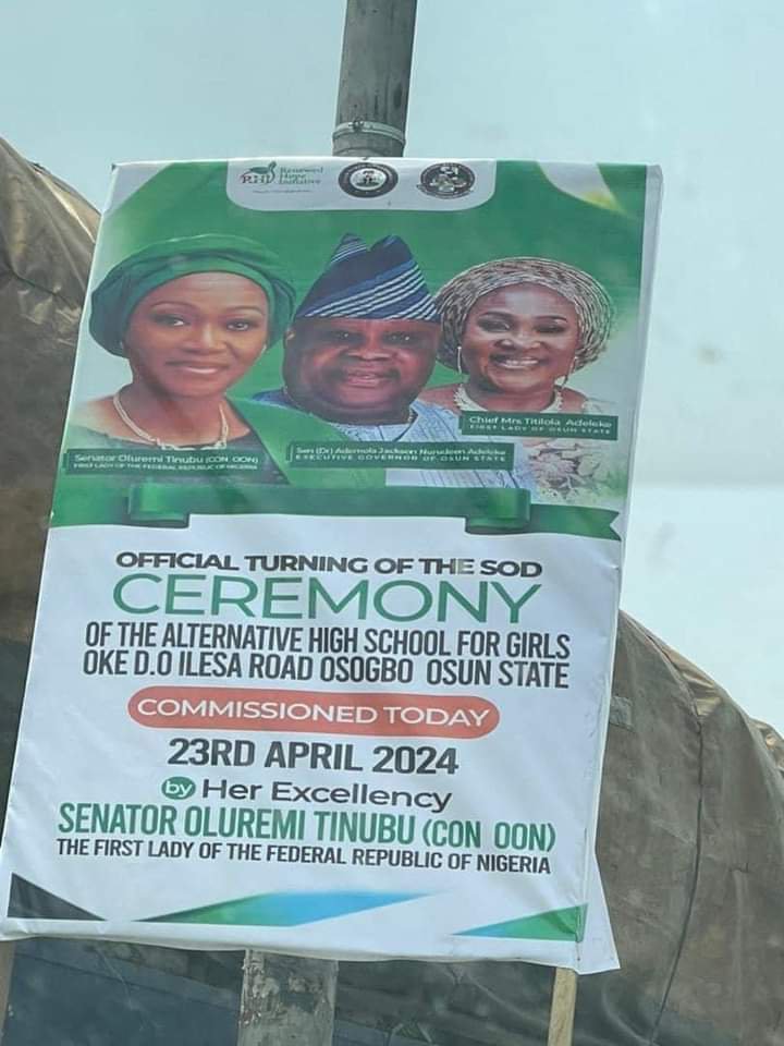 Titilola Adeleke, in her separate poster, also welcomed Mrs Tinubu to the “Official turning of the sod ceremony of the Alternative High School For Girls at Oke D.O, Ilesha Road, Osogbo”