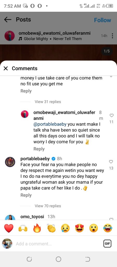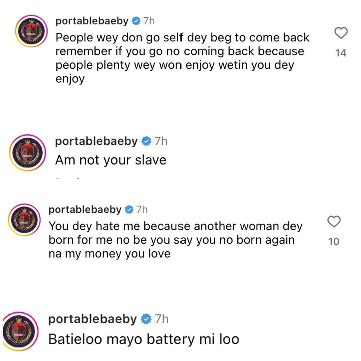 Commenting on the post, Portable stated that Omobewaji would be nothing without him. He also claimed that she has refused to have another child with him, but told him that she wants his money instead.