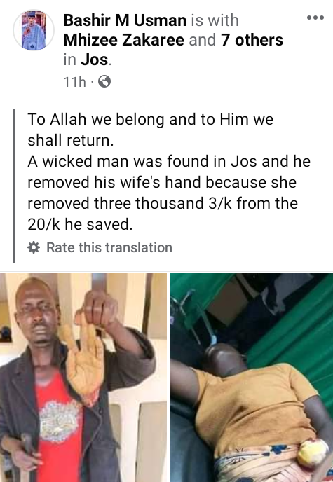 A Jos resident, Bashir M Usman, who disclosed this in a Facebook post on Monday, April 29, 2024, said the man severed her hand from the wrist because she allegedly took N3000 out of his N20,000 savings.