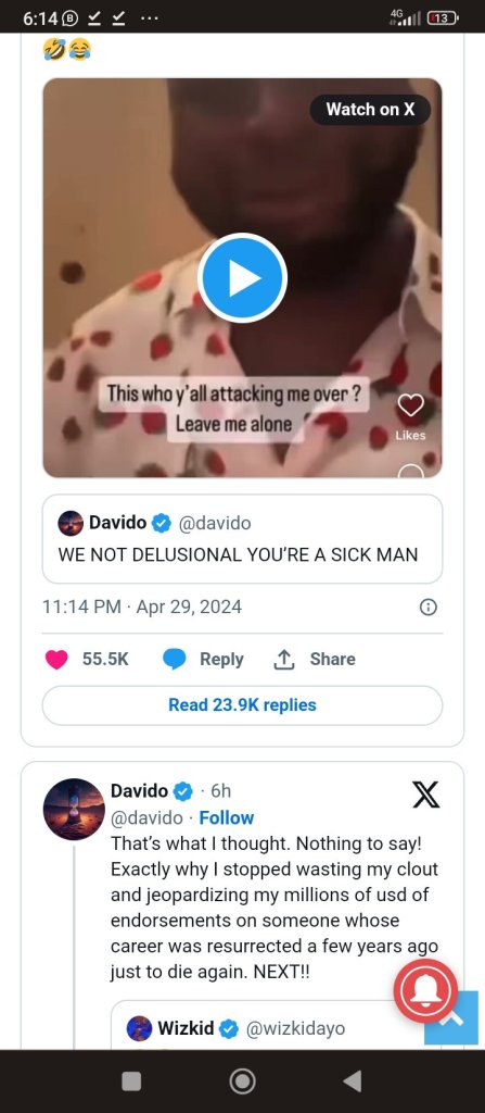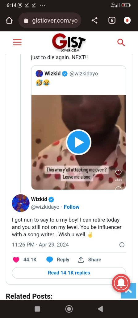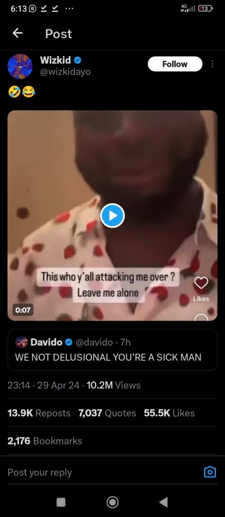 Wizkid’s post onbsocoal media read, “U and all ur crew plus ur pant washer song writer go to sleep at night thinking you actually got anything on me in music 🤣😂 wish u all.”