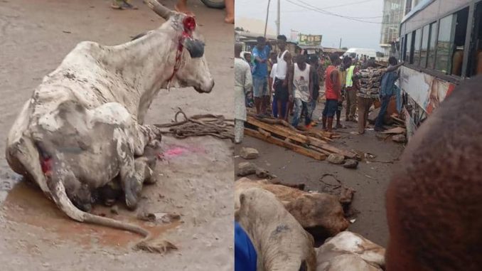Onlookers accounts noted that the BRT was parked loading its passengers at the bus stop before the truck loaded with cows heading to Lagos rammed into it, taking it off the road to destroy shops and kiosks by the roadside.