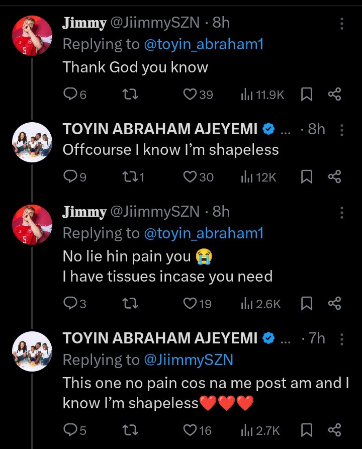 Another troll attempted to mock her further, suggesting that she was in pain and offering her tissues, but Toyin countered by pointing out that she couldn’t be in pain since she was the one who posted the video herself, confidently embracing her body shape.