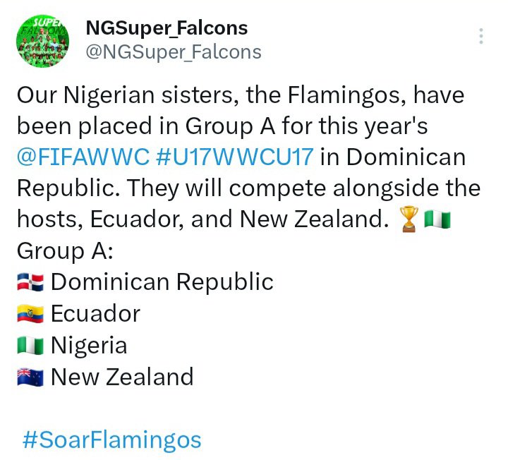 Nigeria has been drawn in group A of the 2024 FIFA Under 17 Women’s World Cup which will take place in the Dominican Republic from 16 October – 3 November 2024.