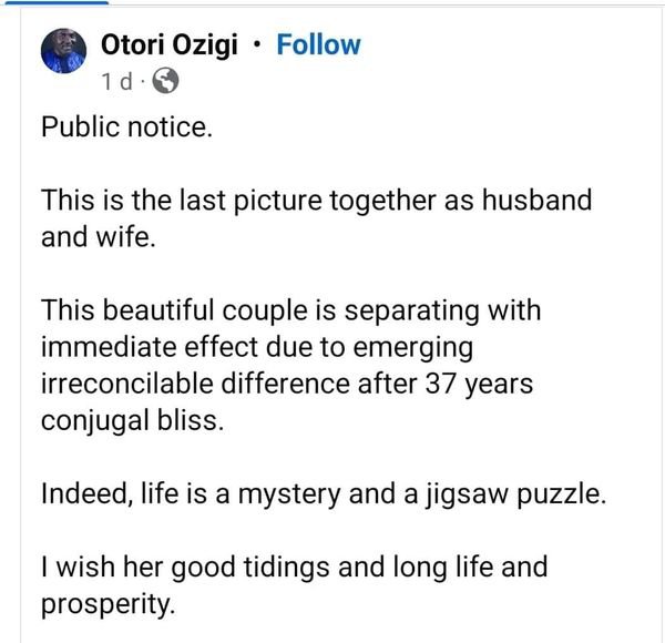 Veteran Nigerian journalist from Kogi State, Otori Ozigi, has announced separation from his wife of 37 years.
