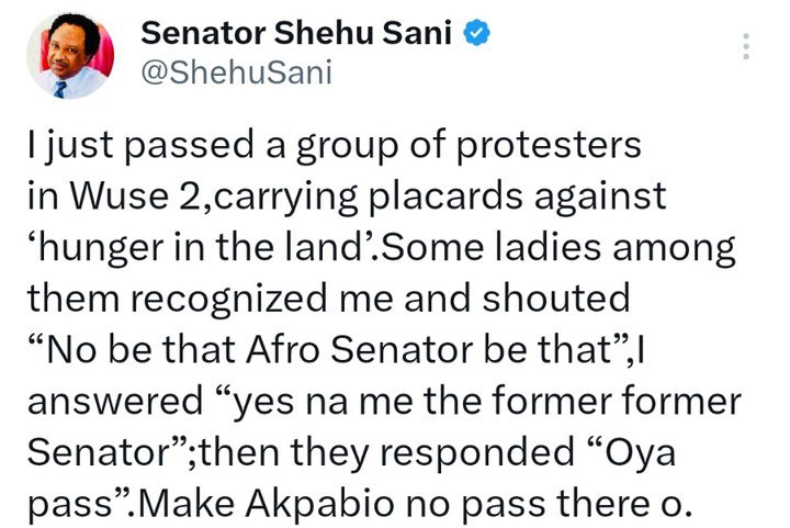Former Senator, Shehu Sani has recounted that he passed through a group of protesters in Wuse 2, carrying placards against ‘hunger in the land’.
