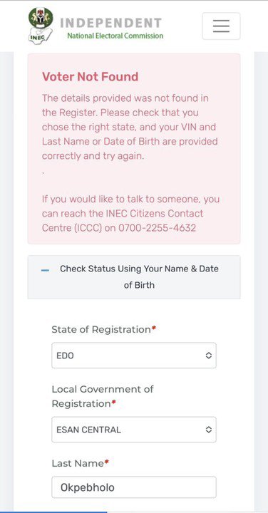 However, upon repeated verification on INEC’s official voter verification portal (https://cvr.inecnigeria.org/vvs), it was found that Sen. Okpebholo’s name is not registered to vote in any of the 18 local governments in Edo State, including his local government of Esan Central. The portal consistently returned a “Voter Not Found” message for the Senator.