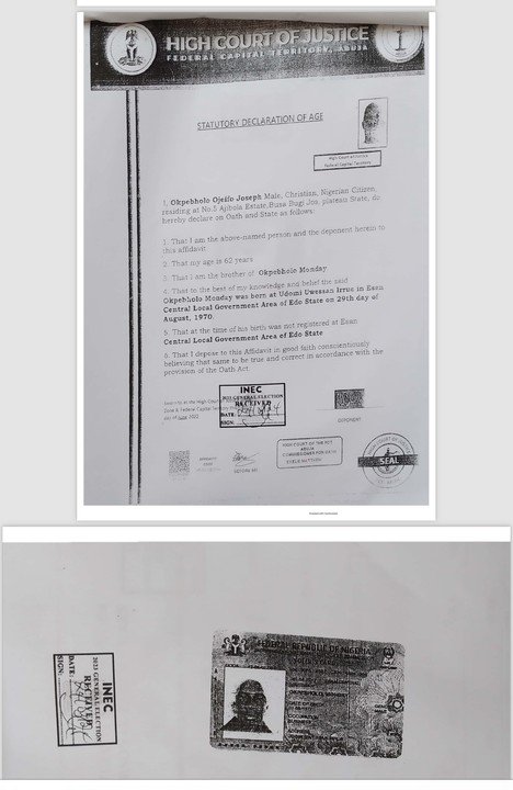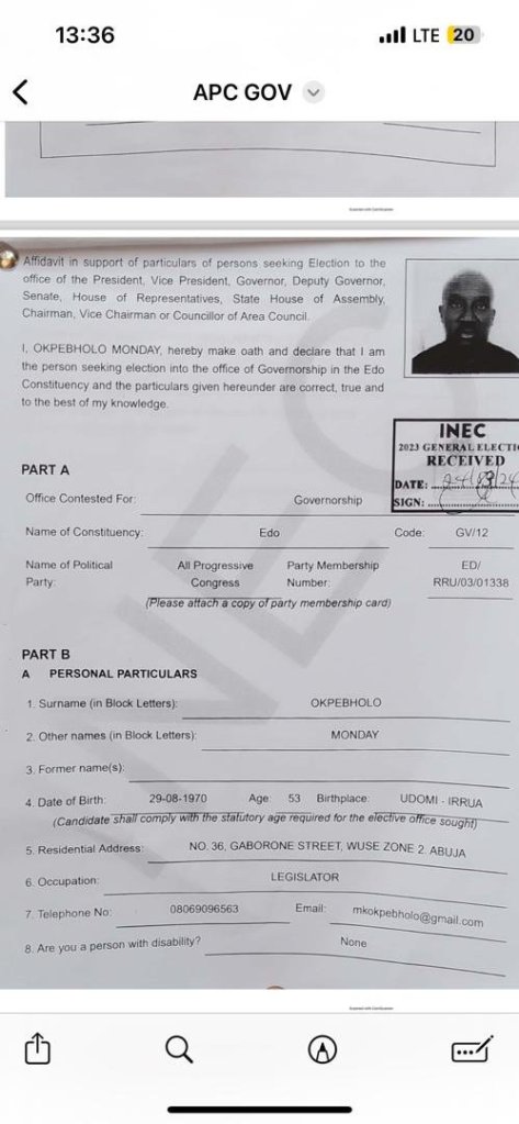 According to the details submitted by Sen. Okpebholo in his Form EC9 affidavit, which was sworn to on March 5th, 2024 at the Federal High Court in Abuja and subsequently published by INEC, his full name is Monday Okpebholo, and he was born on August 29th, 1970 in Irrua, Esan Central Local Government.