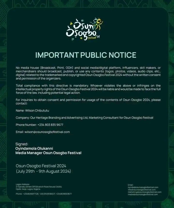 2024 organizers of the Osun-Osogbo Festival have banned media houses, social media influencers, skit makers, and merchandisers from covering the 2024 event.