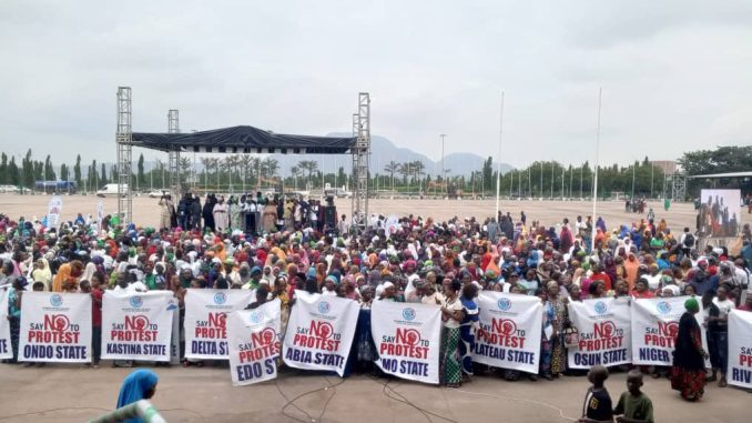 Ahead of the August 1st nationwide protest against bad governance, a group of women is currently staging a rally in Abuja tagged “Say No to Protest.”