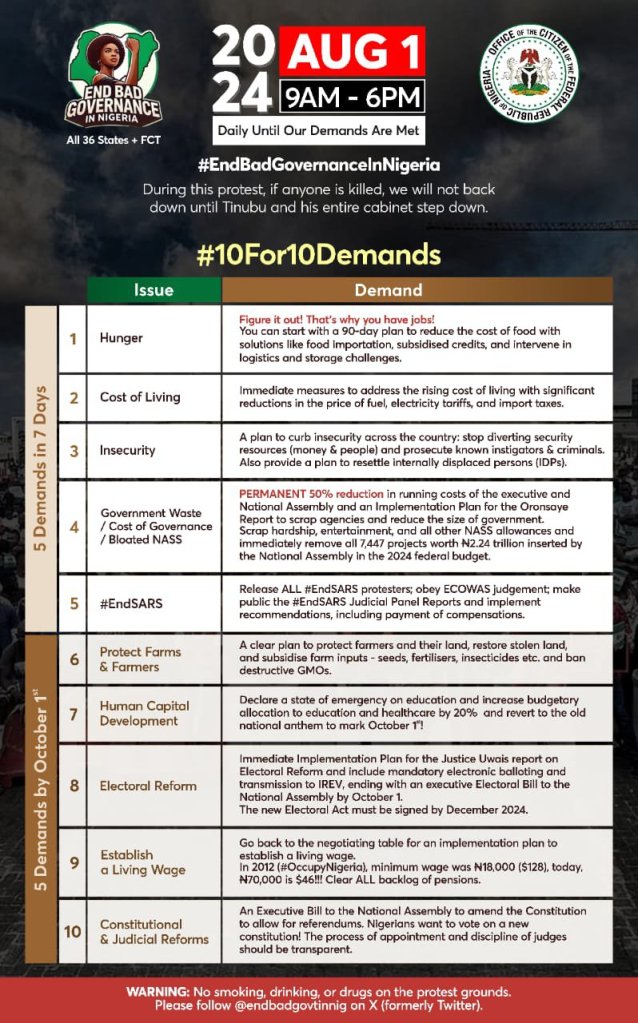 According to the statement released on their X account formerly know as Twitter, the office of the Citizen have stated out the 10 demands for the first 7 days and the time fixed for 9am to 6pm everyday.
