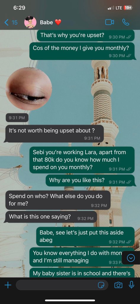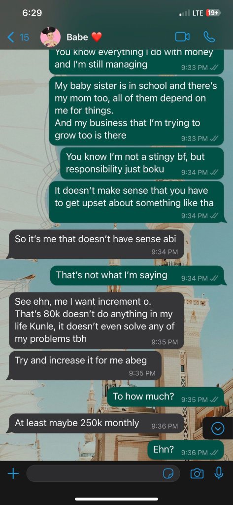 In the leaked chat, the girlfriend, whose previous monthly allowance was N80,000, demanded an increase to N250,000 after discovering that her boyfriend, Kunle, earns N800,000 a month.