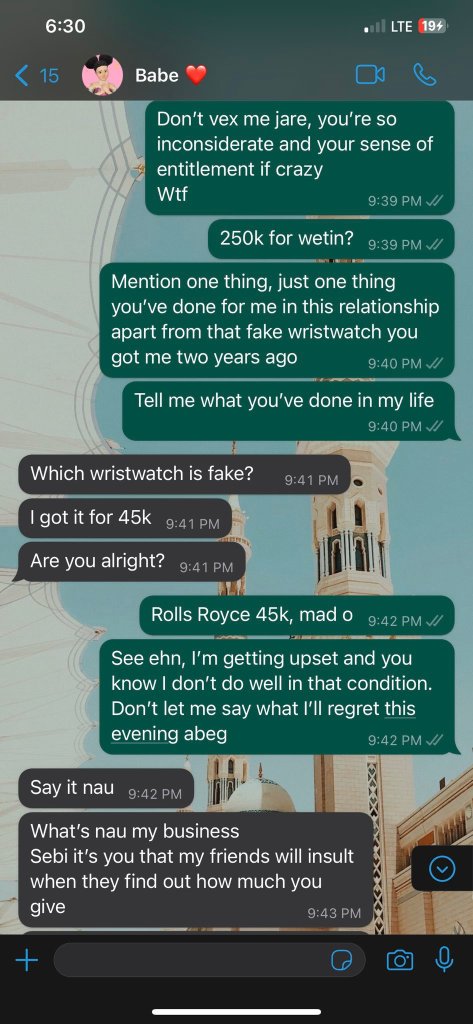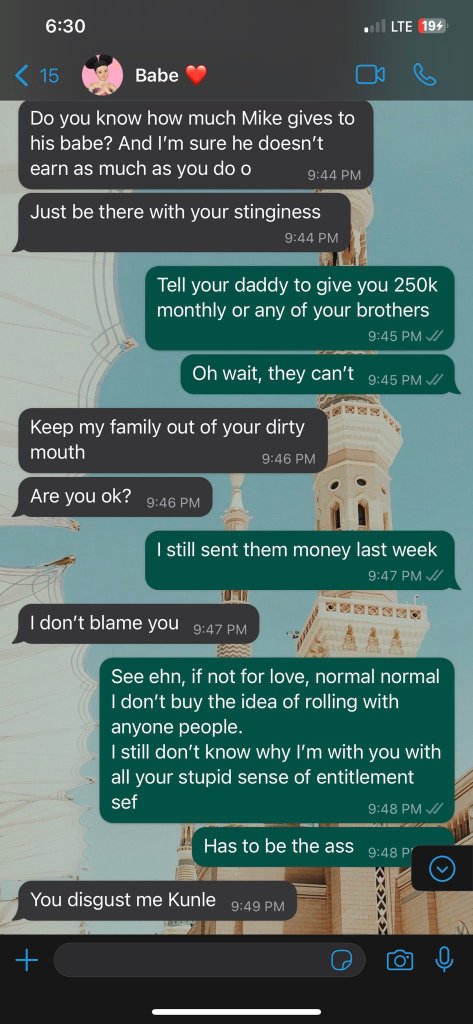 “Tell your daddy to give you N250k monthly or any of your brothers. Or wait, they can’t. You are so inconsiderate and your sense of entitlement is crazy. Tell me what you have done in my life. Your overblown sense of entitlement and lack of intelligence is annoying.”