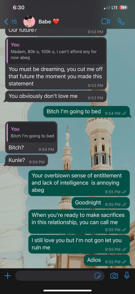 A leaked chat between a Nigerian man and his girlfriend, showcasing the man’s response to her demand for N250k monthly from his N800k salary, has gone viral.