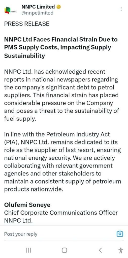 Chief cooperate communications officer, Olufemi Soneye, disclosed this Via a press release signed and released on the official X handle of NNPC.