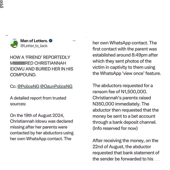 Kidnapped 300-level student of the Federal University of Agriculture, Abeokuta State (FUNAAB) Christianah Idowu, was allegedly k!lled by a friend named Adeleye Ayomide after collecting ransom from her parents.