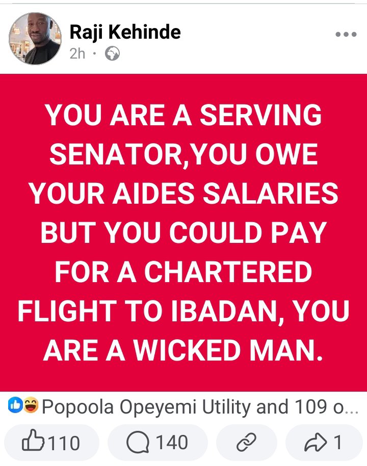 Raji Wrote; “YOU ARE A SERVING SENATOR,YOU OWE YOUR AIDES SALARIES BUT YOU COULD PAY FOR A CHARTERED FLIGHT TO IBADAN, YOU ARE A WICKED MAN.