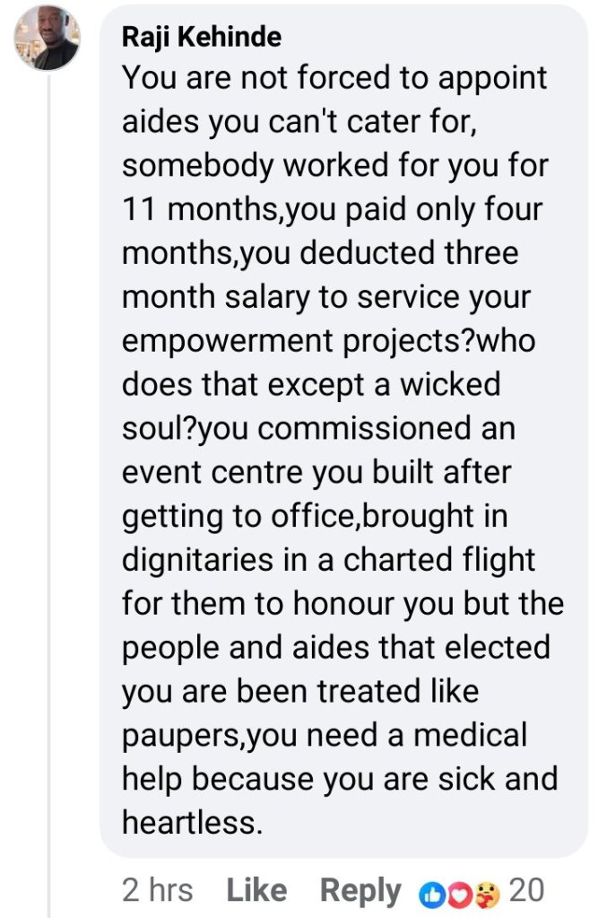 “You are not forced to appoint aides you can’t cater for,somebody worked for you for 11 months,you paid only four months,you deducted three month salary to service your empowerment projects?who does that except a wicked soul?you commissioned an event centre you built after getting to office,brought in dignitaries in a charted flight for them to honour you but the people and aides that elected you are been treated like paupers, you need a medical help because you are sick and heartless.”