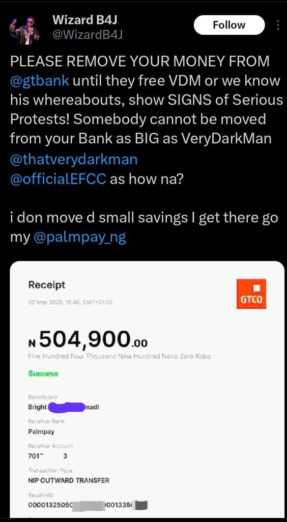 Wizard B4J (@WizardB4J) posted on X, encouraging people to remove their money from GTBank until VeryDarkMan is freed.